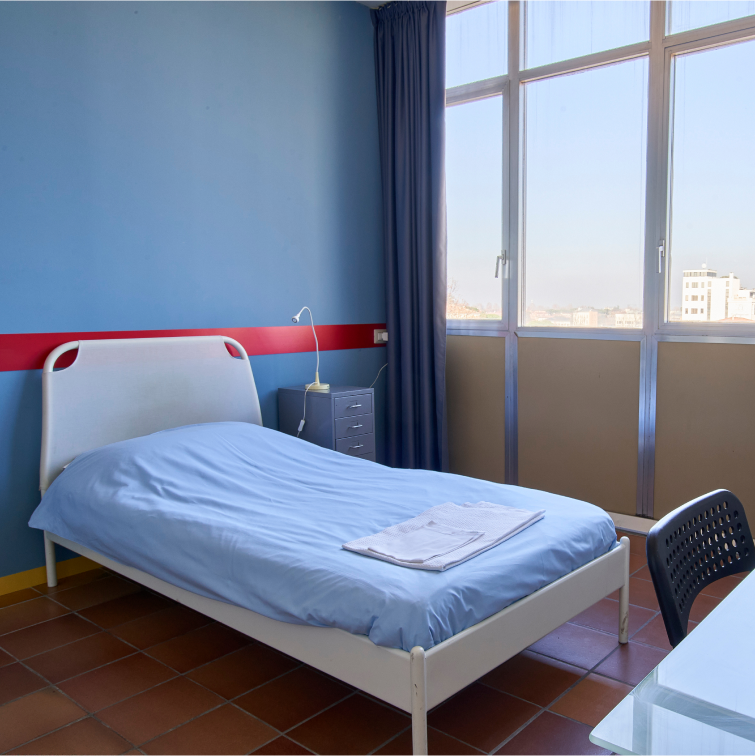 This room is equipped with a single bed, and is the ideal solution for those who come to Forlì alone, both for study or work purposes. Each single room has a private bathroom with shower